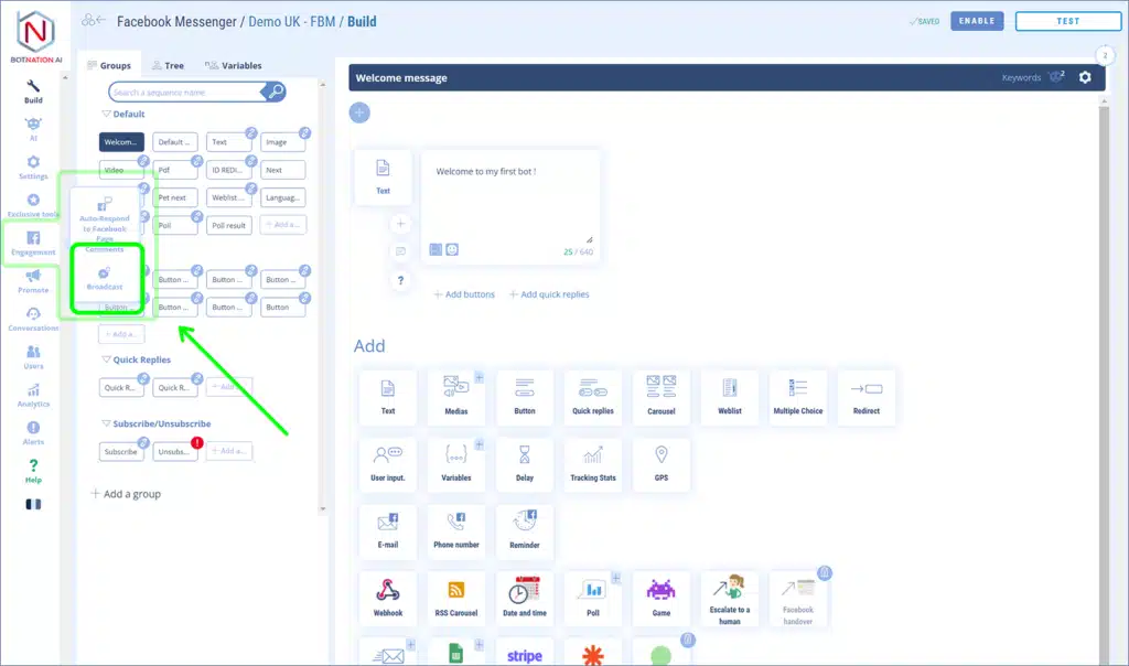 As for the notifications, click on “Engagement” and then on “Broadcast”.