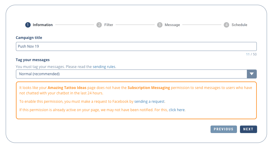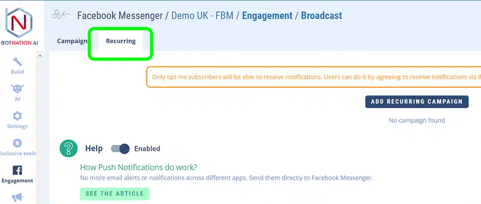 Easily add a recurring Facebook Messenger notification that will run regularly.