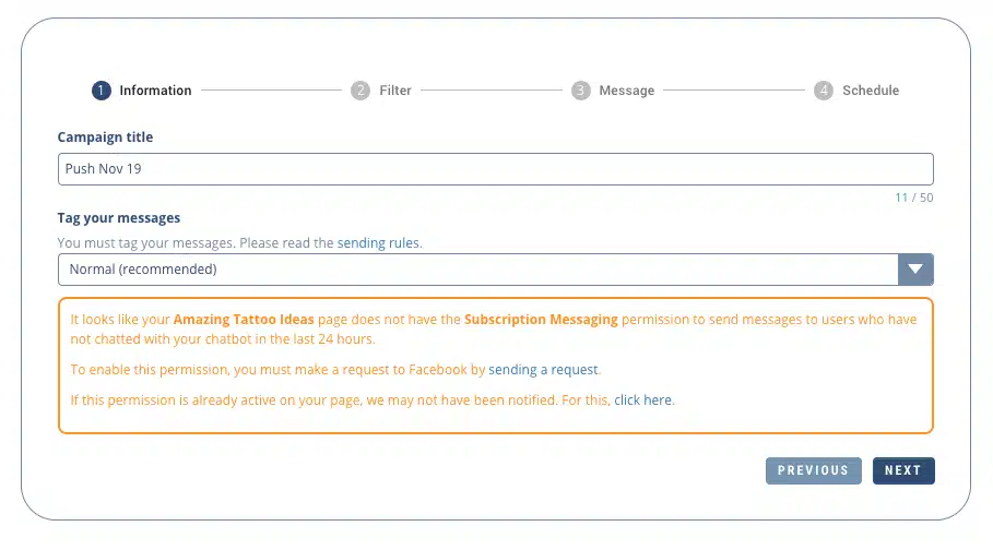 This is a Facebook Messenger notification that will be sent regularly during a defined period. For example, with this feature, you can send a notification every day or every Friday and Sunday of each week.