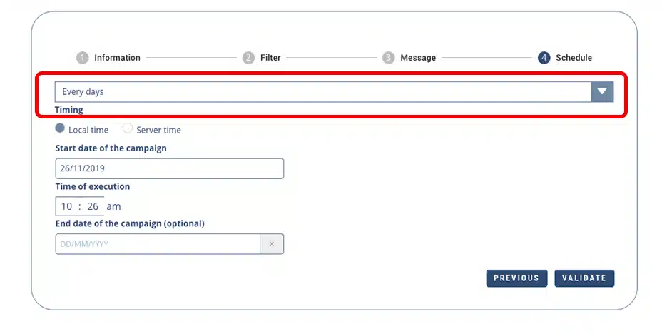 The scheduling screen is very similar to a simple notification screen except that here you can choose the frequency of sending using the drop-down list circled in red.