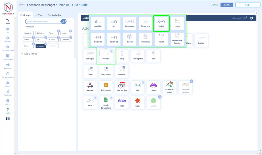 Among the construction features, click on “Variables” and then, in the menu that opens, click on “Replace”.