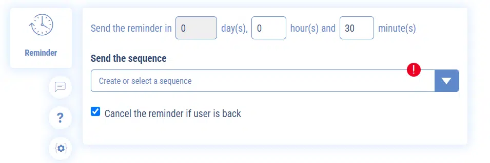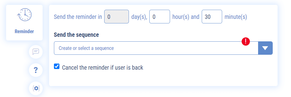It is possible to automatically set a sequence during the conversation that will automatically call the user back to a sequence after X minutes or X hours if, for example, the user is inactive.