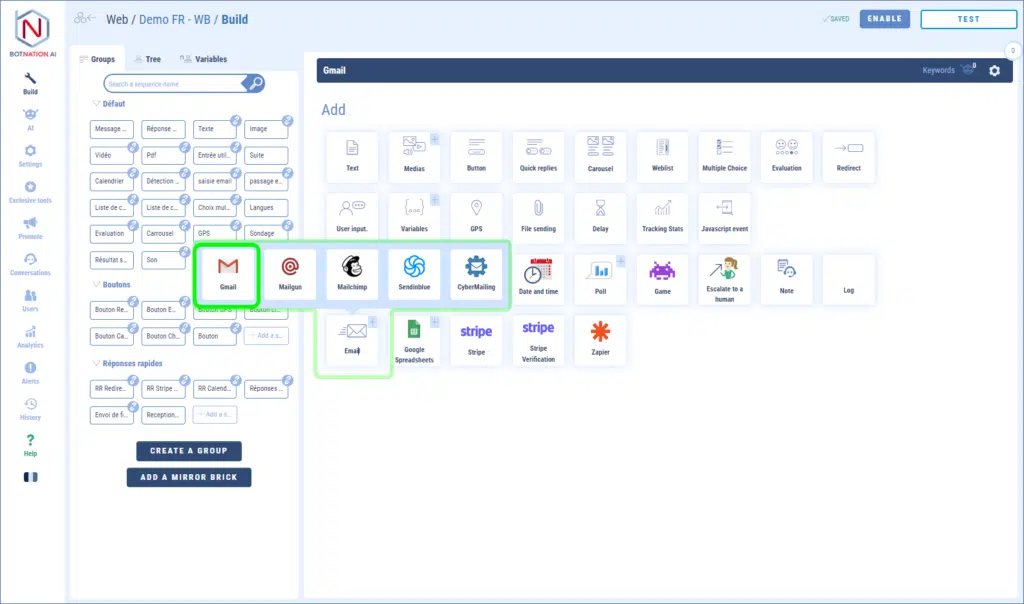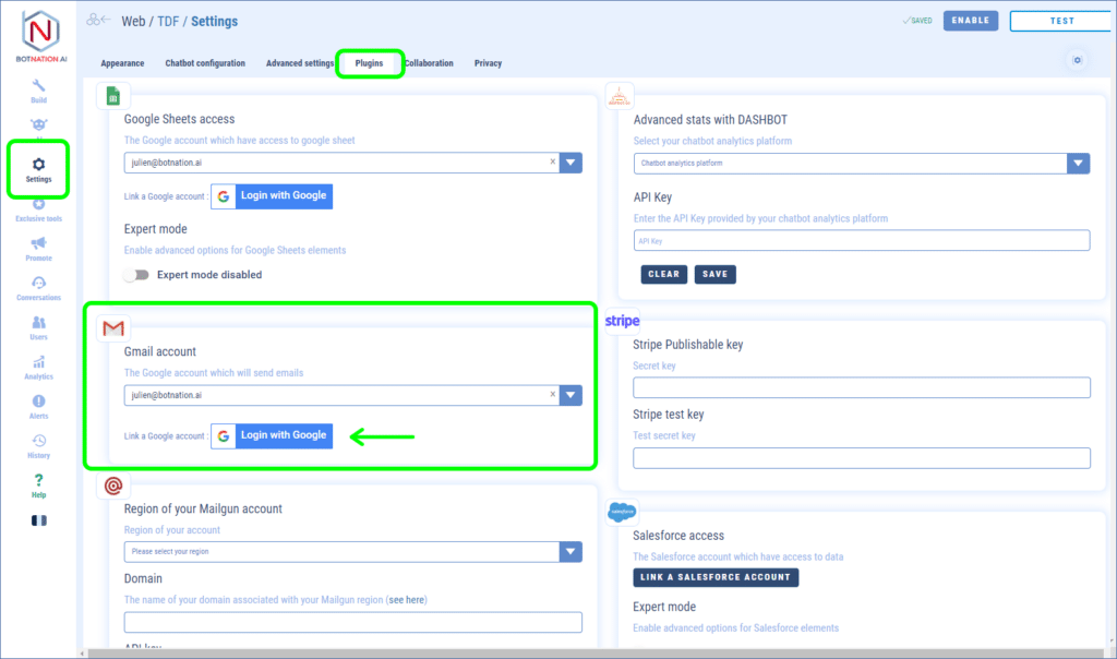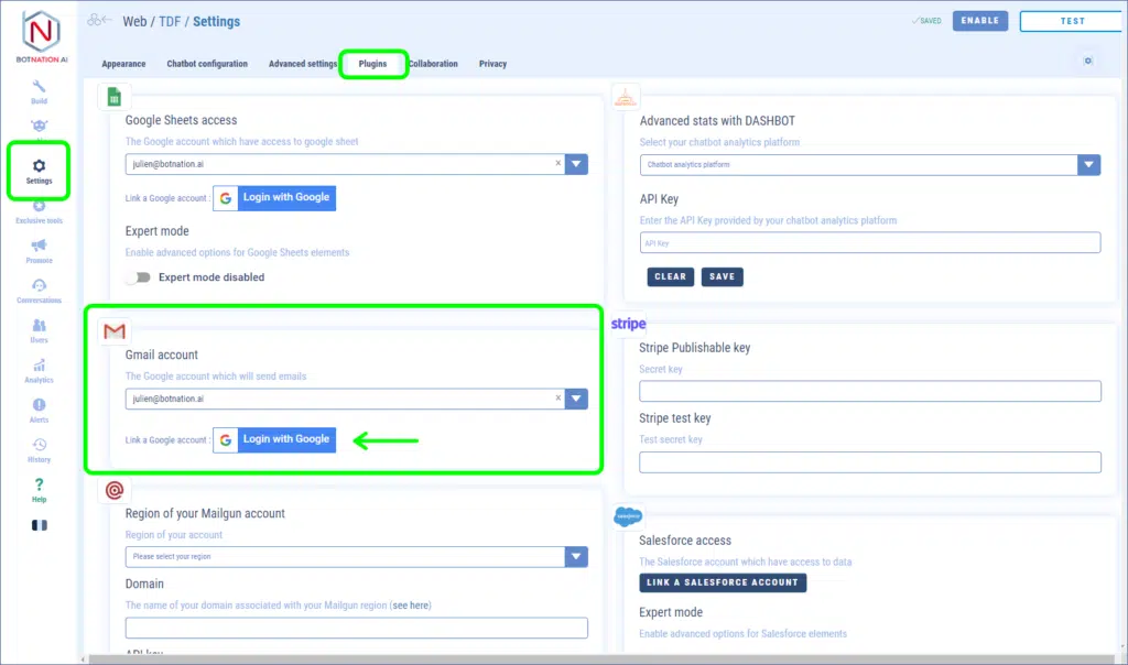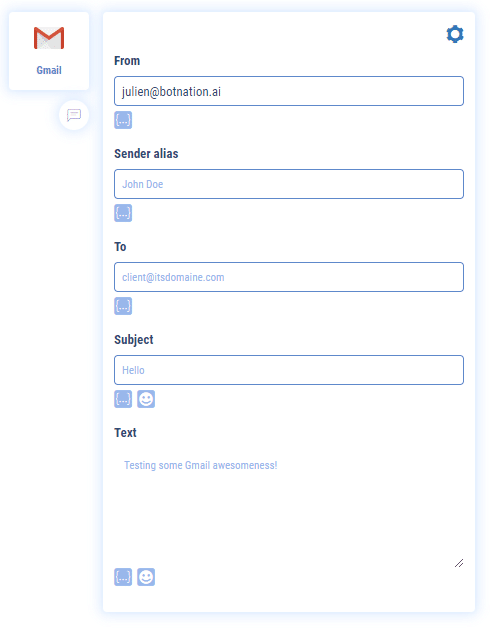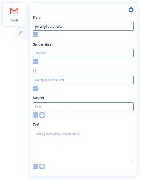 On Botnation, it’s easy for your chatbot to send information by email! You just need to set up the Gmail plugin on your Chatbot settings.