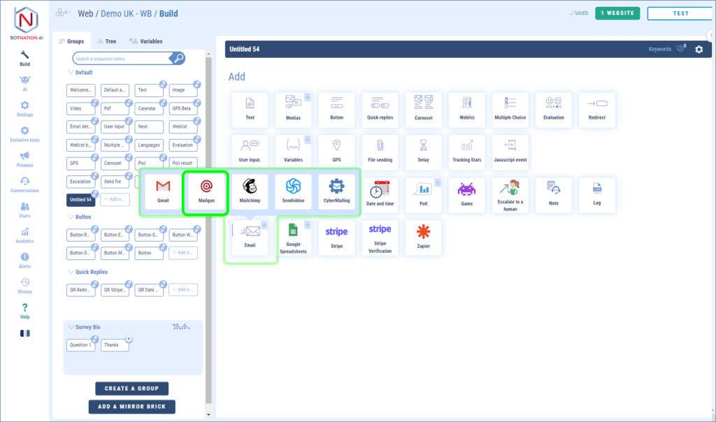 Among the building features, click on “Email” and then, in the menu that opens, click on “Mailgun”.