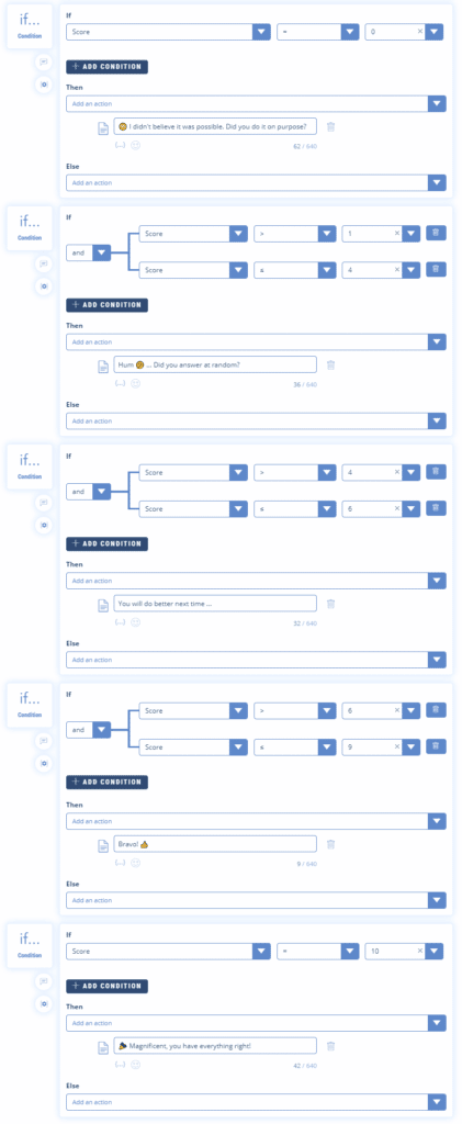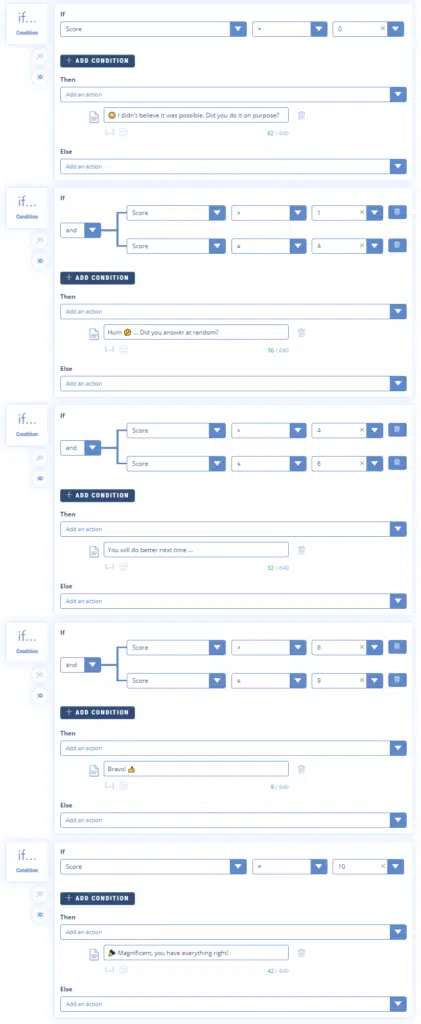In this example, we use the “IF Condition” feature to display a different text depending on the user’s score (between 1 and 5).
