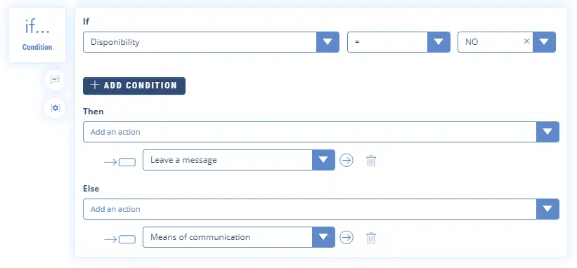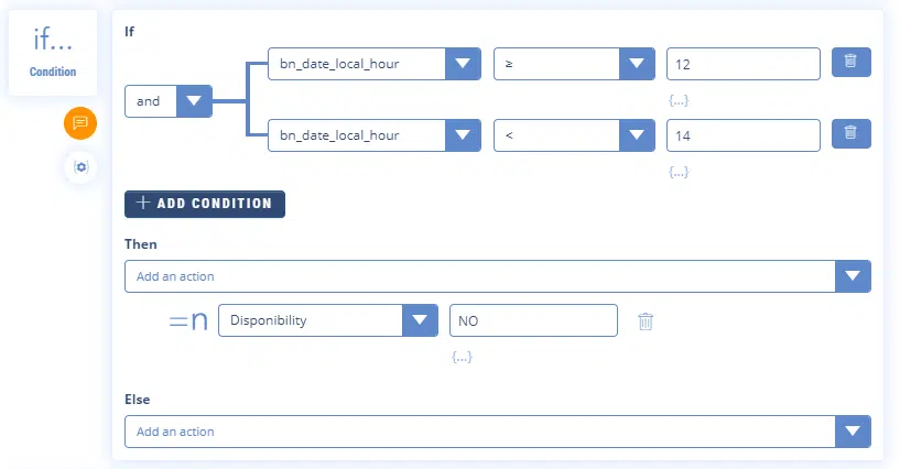 In this example, we use the “IF Condition” feature to determine the availability of a consultant knowing that he is not free between 12:00 and 14:00. This translates into: IF the date variable “bn_date_hour” ≥12 AND IF the variable “bn_date_hour” <14 THEN the advisor is not available (the variable “expert_advisor” will take the value “Busy”).