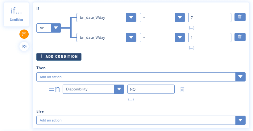 In this example, we use the “IF Condition” feature to determine the availability of a consultant based on the day of the week: IF we are Saturday (bn_date_Wday = 7) OR IF we are Sunday bn_date_Wday = 1) THEN the advisor is not available (the variable “expert_advisor” will have the value “Busy”).