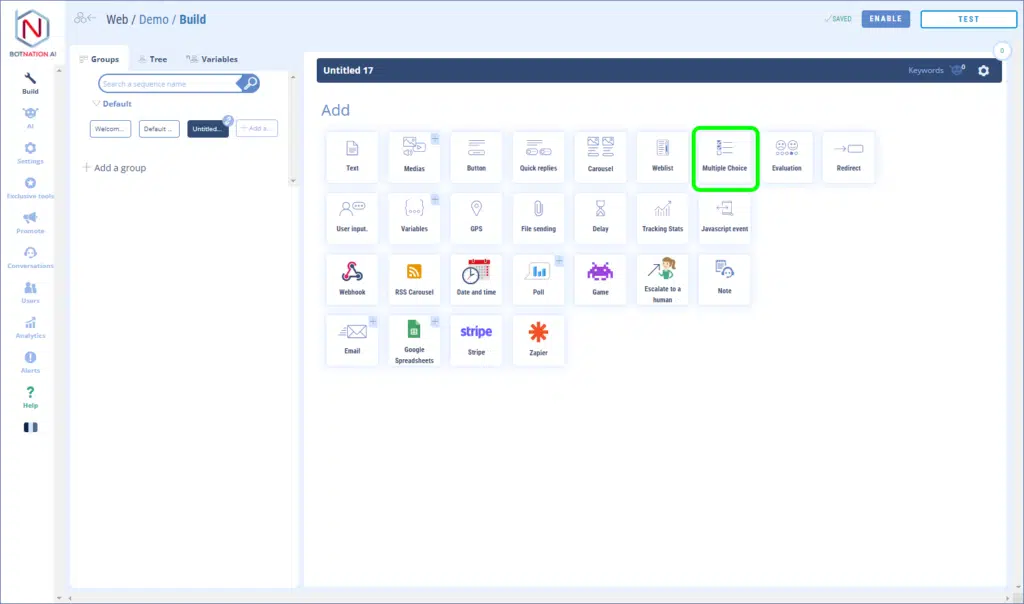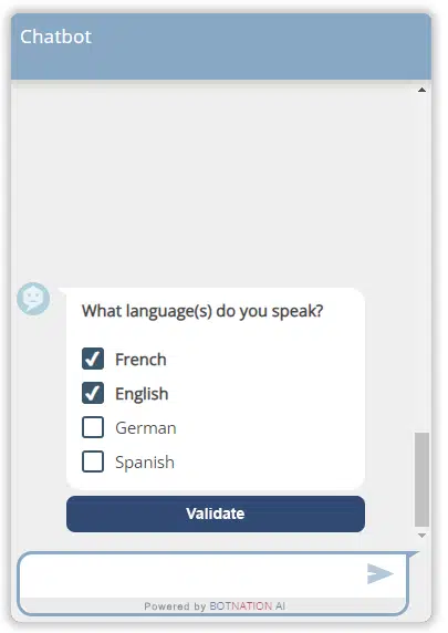 The multiple choice list is a feature of Botnation AI that allows you, for example, to display a list of possible answers where it will be possible for the user to select more than one, both on a chatbot for your website and Facebook Messenger.