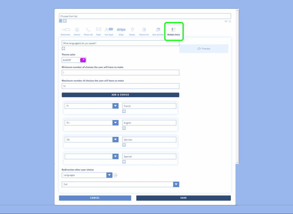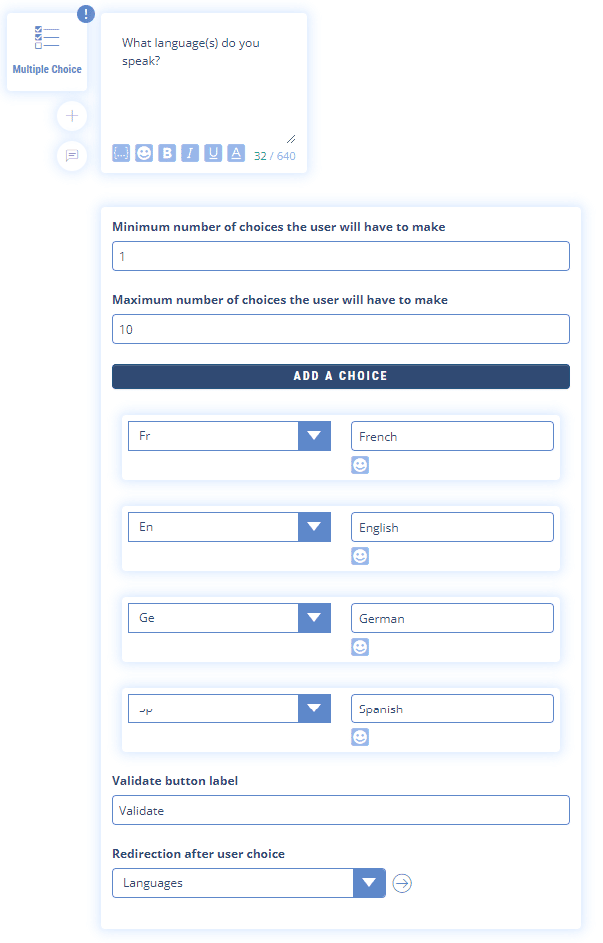 You can enter the question that will be displayed above the list of choices, the minimum and maximum number of choices the user will have to make and the redirection sequence once the user has validated his choices.
