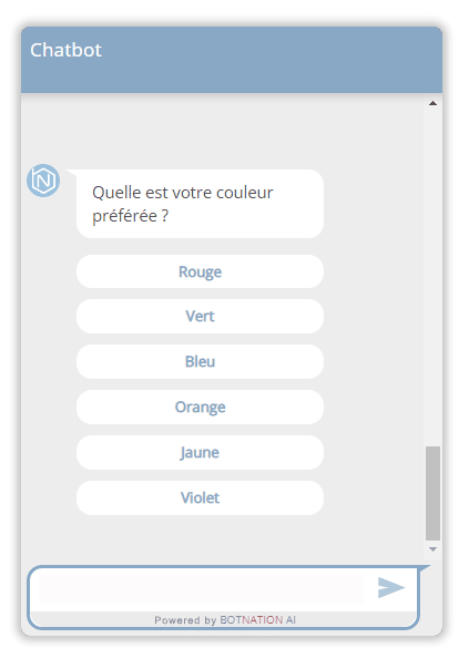 La liste de choix est une fonctionnalité propre à Botnation AI vous permettant, par exemple, d’afficher un bouton de type « choisir une couleur », aussi bien sur un chatbot pour votre site Web que Facebook Messenger.