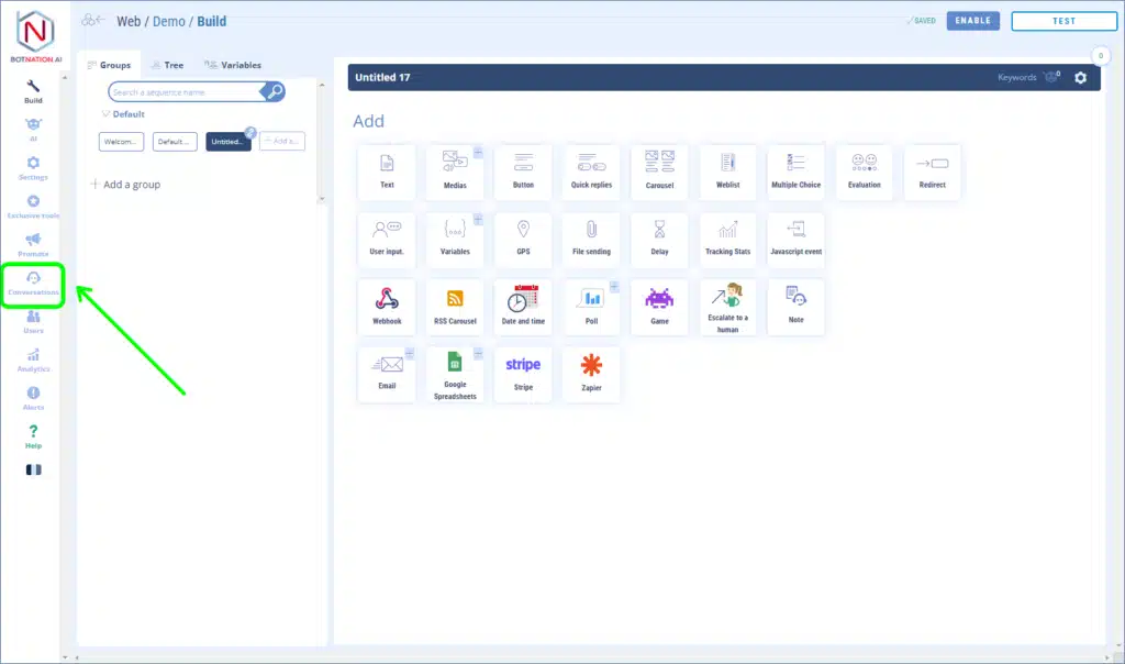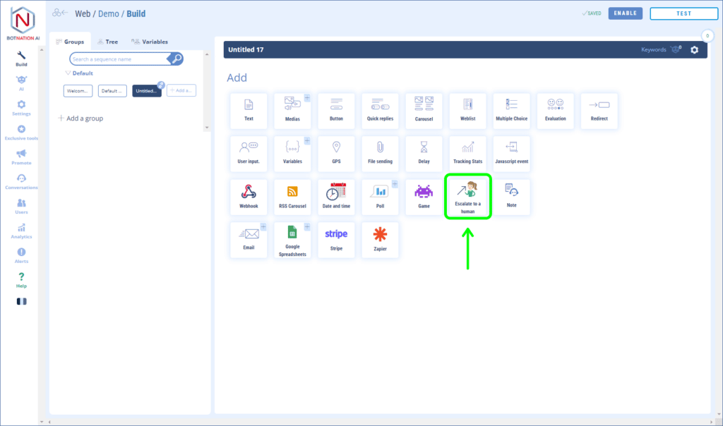 It’s very simple, it’s a function like the others displayed in the chatbot tool BOTNATION AI. You just need to activate it anywhere in your chatbot by enabling the feature.