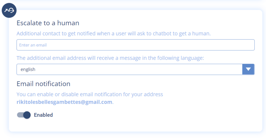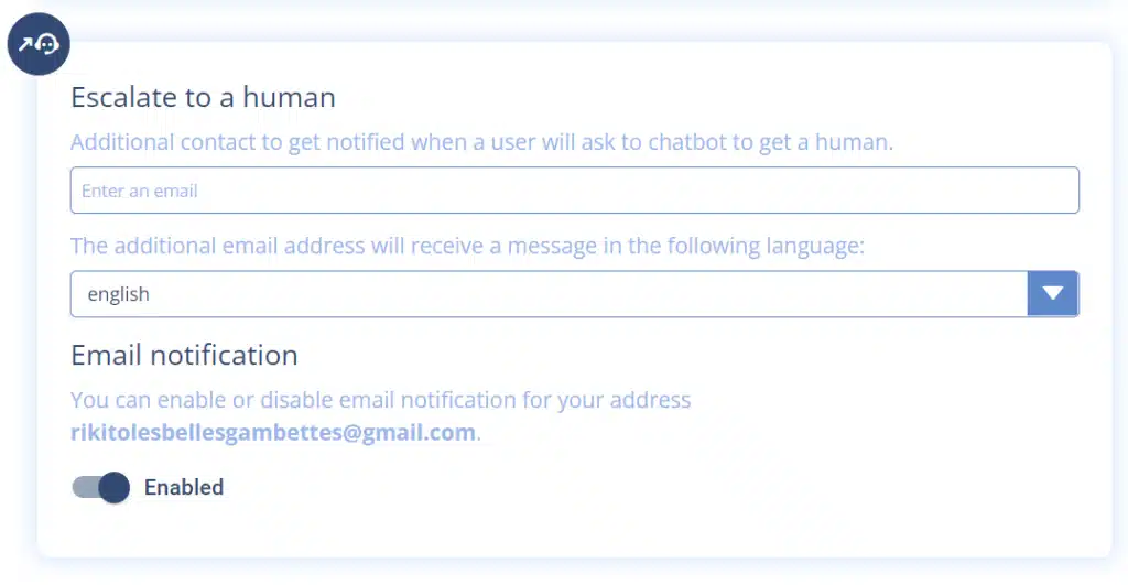 You can be 2 collaborators working on the escalations to human and receiving notifications. Go to Settings > Advanced settings, then to the “Transfer to human” block. You can add another collaborator (you can only add one person in addition to yourself). Enter the email address of your collaborator and validate with the Enter key. It’s done! You will now be 2 to manage the requests.