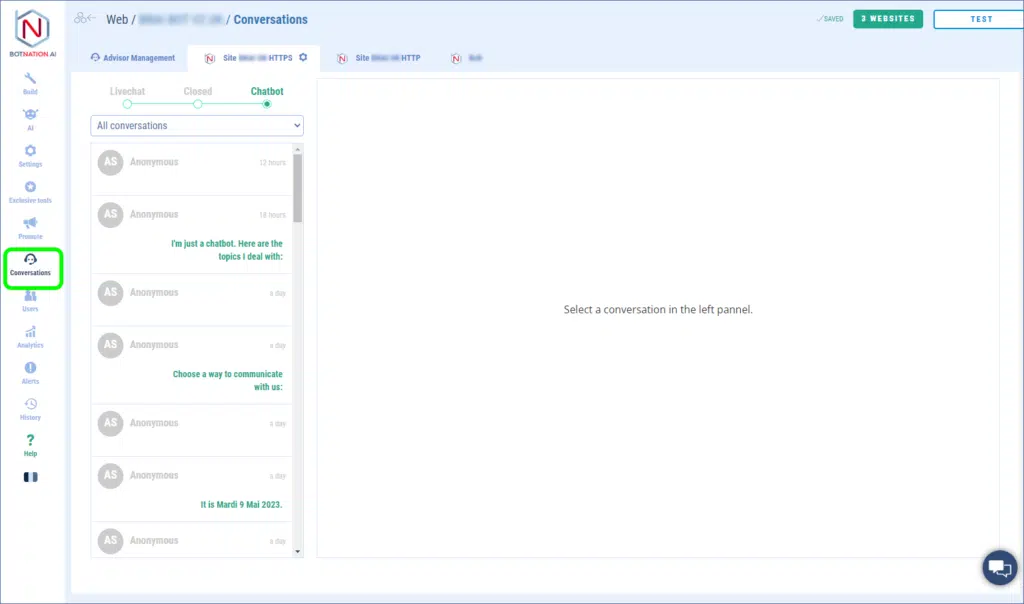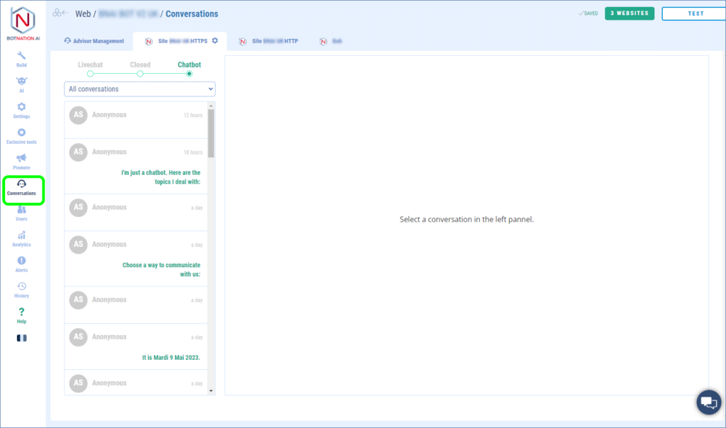 Your web chatbot’s discussions with your users are available in the “conversations” tab in the left management bar of your chatbot.