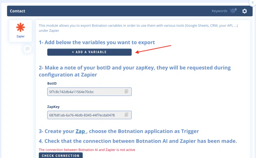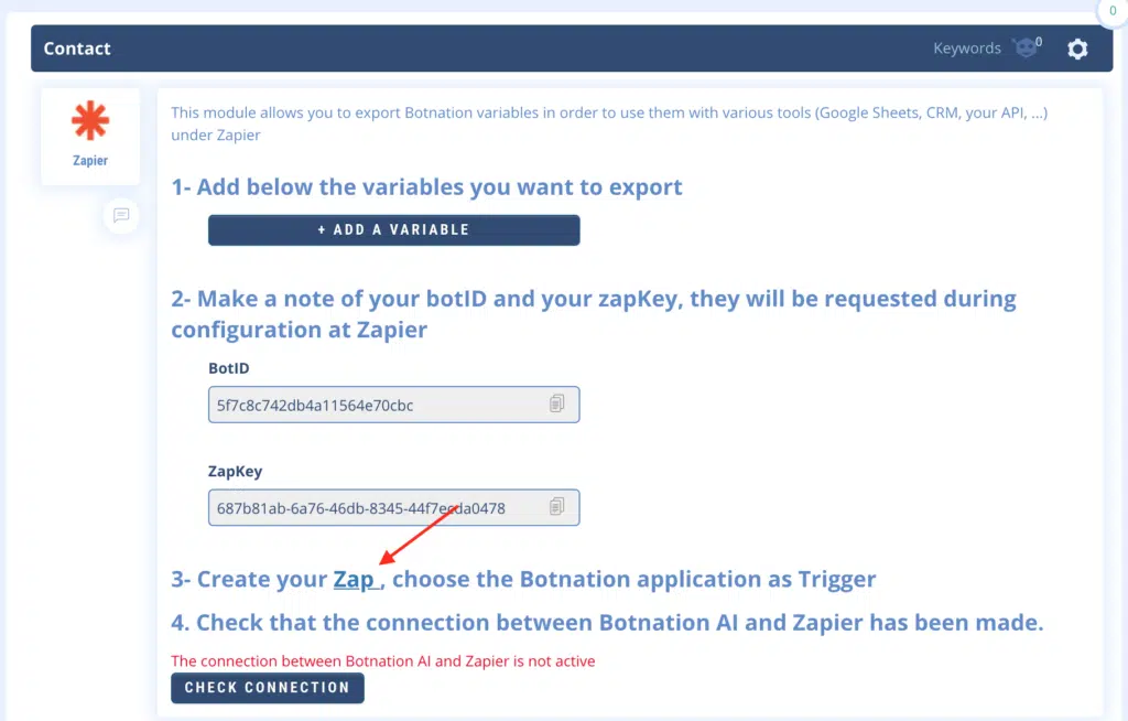 • Once your Botnation Zap is active, if you want to export additional variables, you will have to indicate them on the Botnation side but also edit the Zap on the Zapier side (steps 3 and 4) as you did when creating the Zap so that Zapier will authorize the reception of these variables. Attention: to edit a Zap in Zapier you must first pause it if it is active.