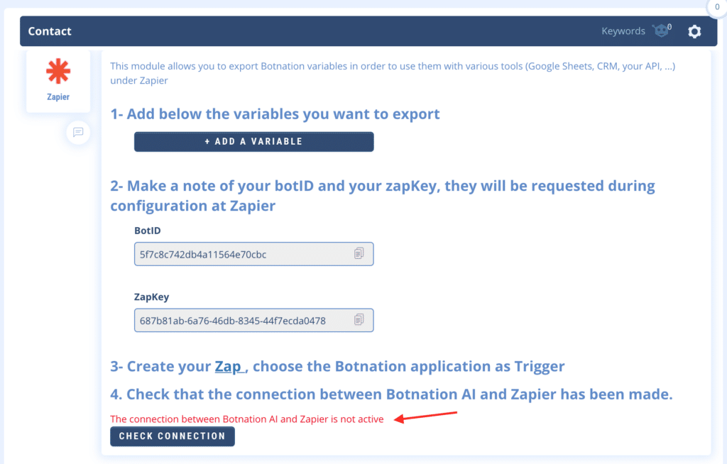 You can also check this connection on Botnation through the equivalent “Check Connection” function of your Zapier.