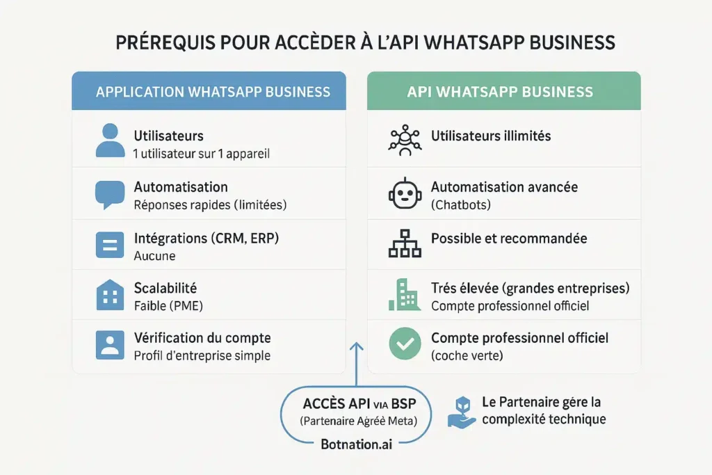 L’accès à l’API WhatsApp Business nécessite une validation par Meta. Botnation AI accompagne les entreprises dans cette démarche, gérant les aspects techniques et administratifs.