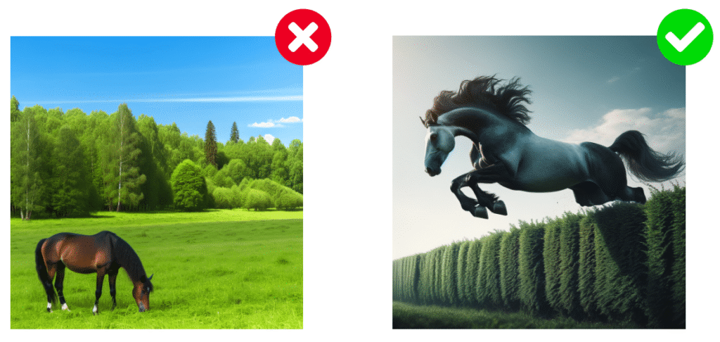 Si vous souhaitez une image dynamique, décrivez des mouvements ou des gestes spécifiques. Par exemple, « un cheval sautant par-dessus une haie » plutôt que simplement « un cheval ».