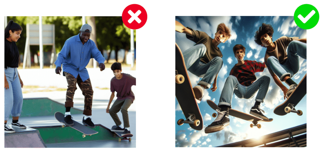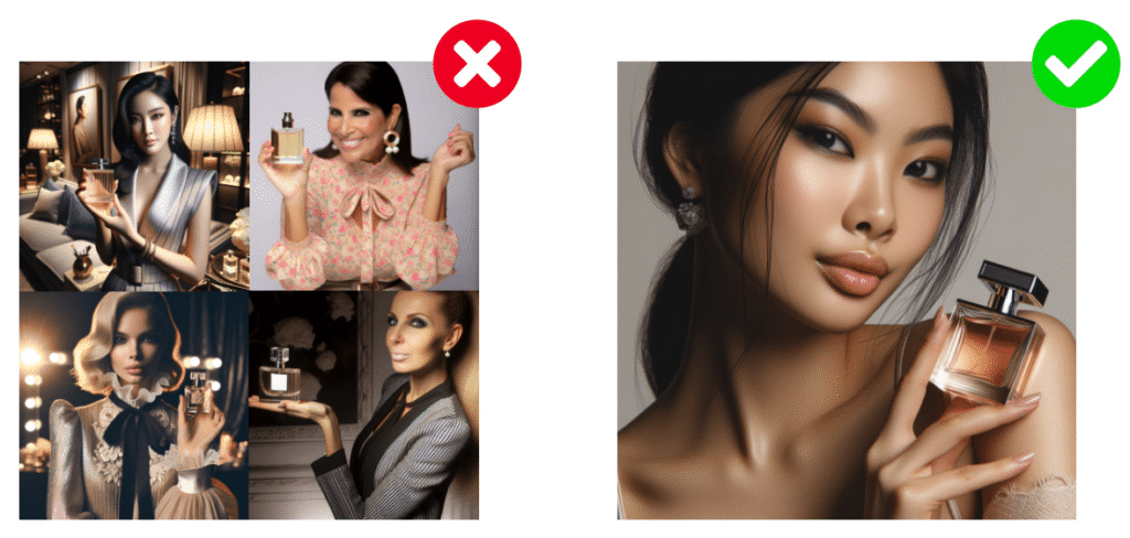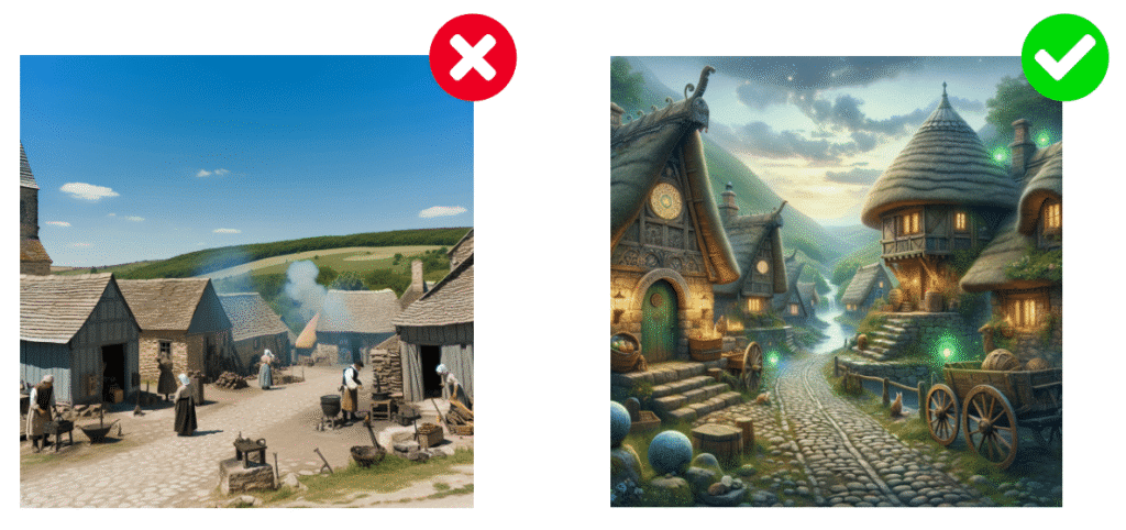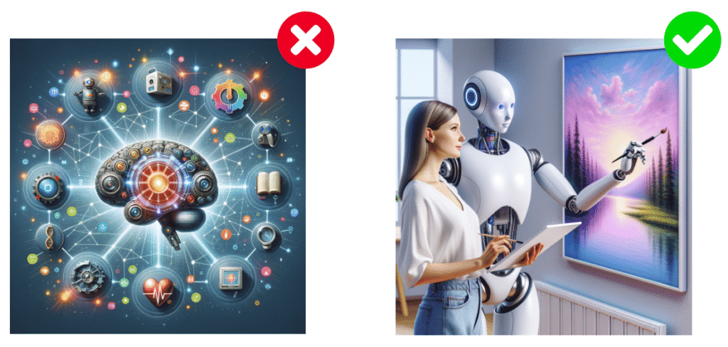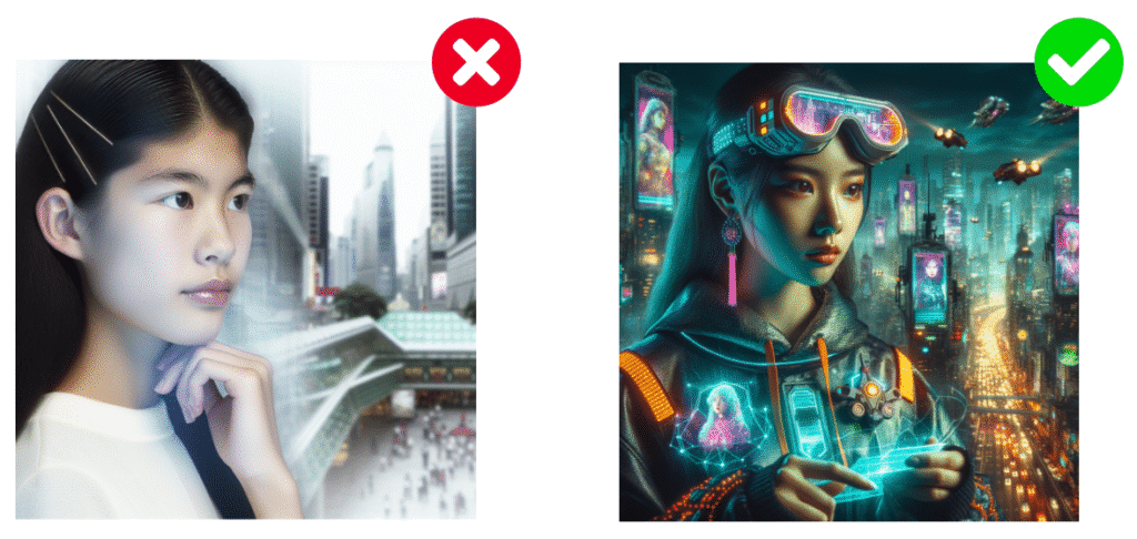 En se concentrant sur une seule idée à la fois, vous obtiendrez des résultats plus ciblés et éviterez les résultats confus ou incohérents de la part de l’Intelligence Artificielle générant votre image.