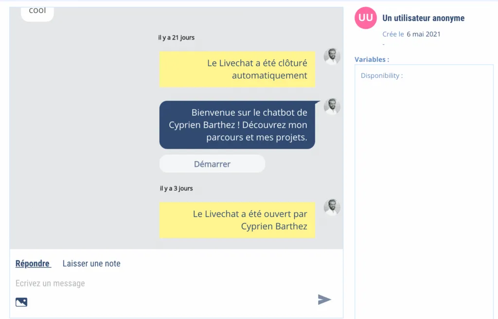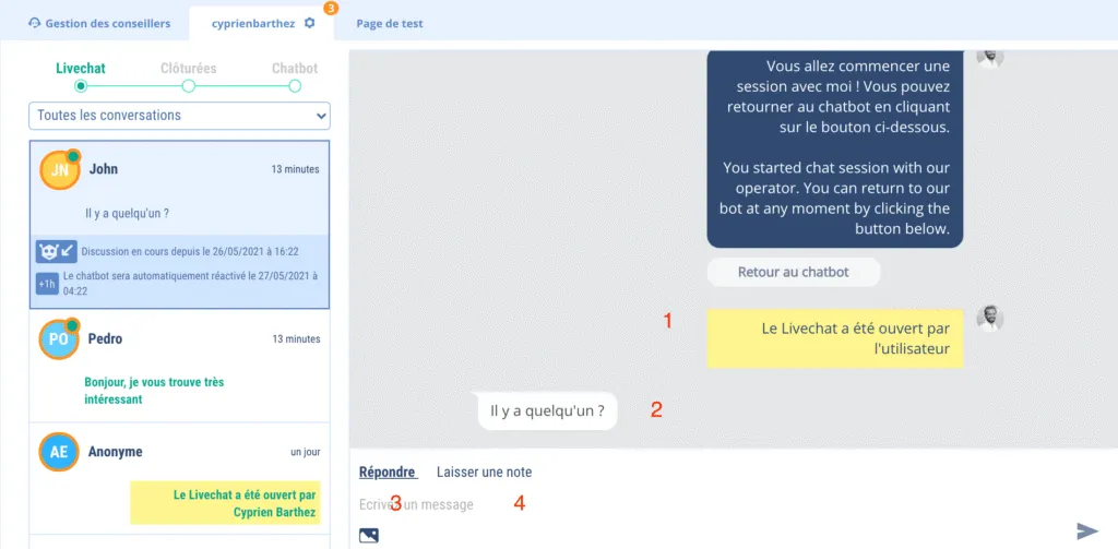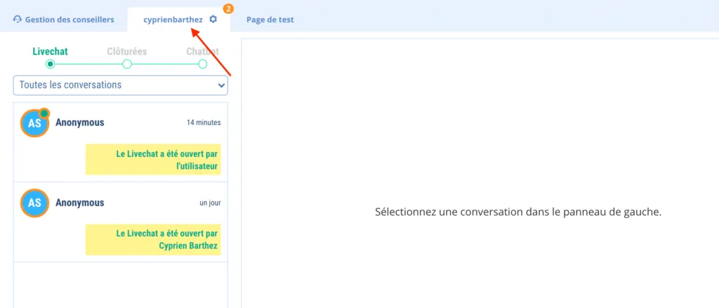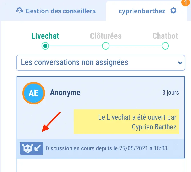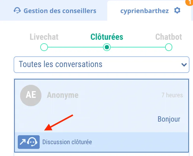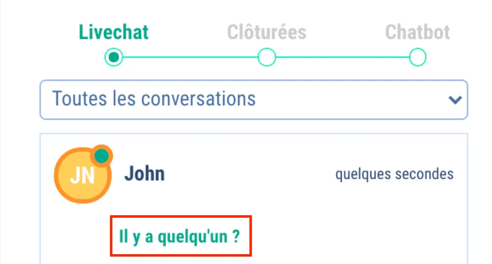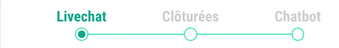 Vous constatez également que le premier point vert « Livechat » affiche les conversations du live chat. Le second « Clôturées » vous montrera les conversations clôturées et le troisième, « Chatbot », les discussions automatisées du chatbot permettant d’accéder à l’historique.