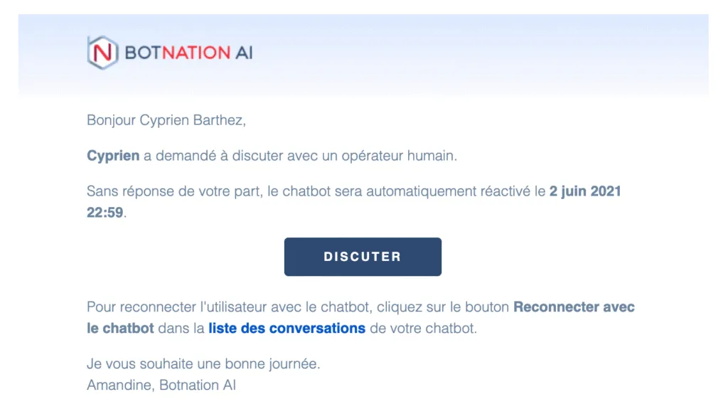 Botnation comporte par défaut un module d’escalade vers l’humain (chatbot hybride livechat). En somme, lorsque le chatbot montre ses limites (car il en a !), vous pouvez proposer de transférer la discussion à un humain, sous forme de live chat. Plusieurs utilisateurs nous ont confié vouloir utiliser le live chat à 100%, sans passer par l’automatisation des conversations par le chatbot.