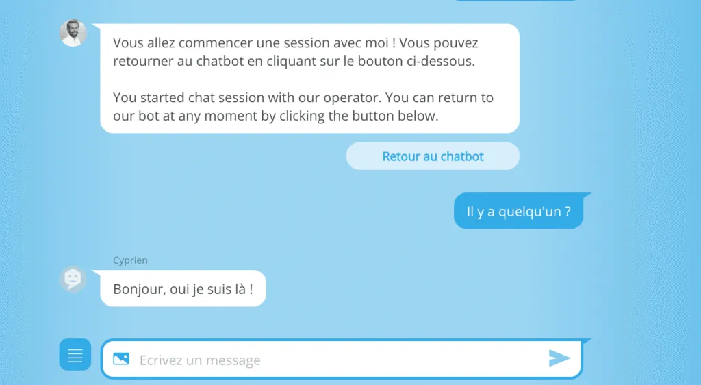 Lorsque l’utilisateur souhaite retourner au chatbot, il cliquera sur le bouton prévu à cet effet (que vous avez préalablement configuré dans l’escalade vers l’humain). Par exemple, il s’agit ici du bouton « Retour au chatbot ». Ensuite, les séquences du chatbot se dérouleront comme vous l’avez programmé.