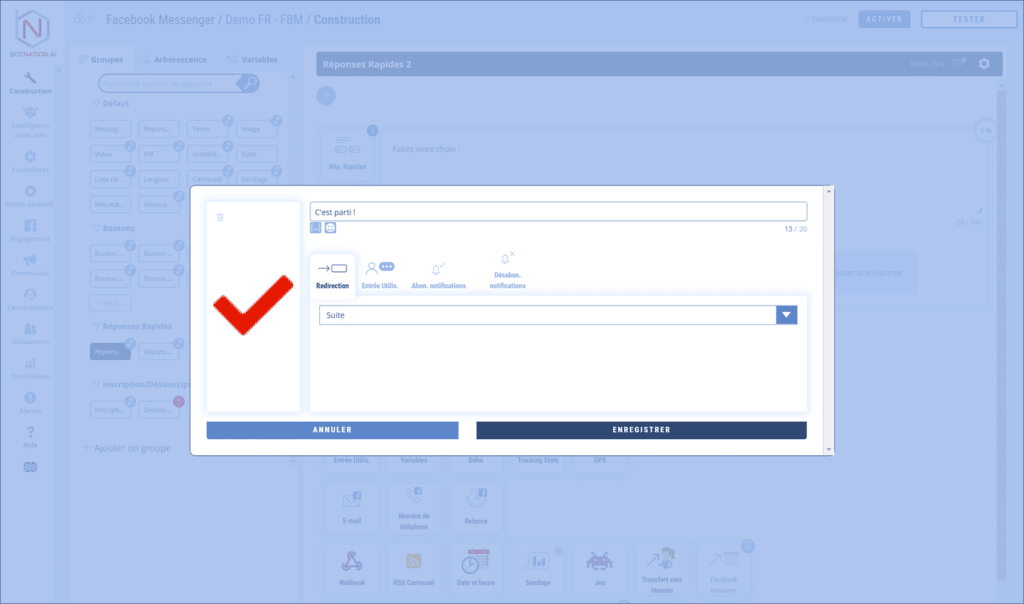 En cliquant sur cette Réponse Rapide, l’utilisateur se désabonne des notifications du chatbot.