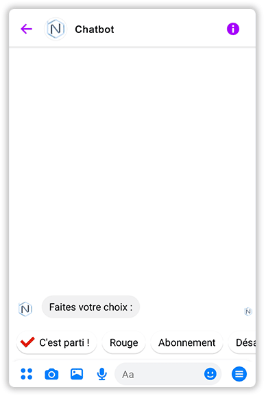 La différence principale avec les boutons, outre le nombre, est qu’une fois que l’utilisateur a cliqué sur une Réponse, cette réponse devient son message et tous les autres choix disparaissent.