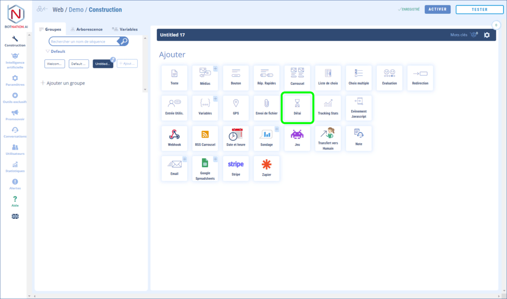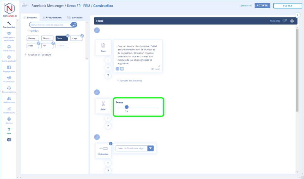 Dans l’exemple ci-dessus, le chatbot affichera le texte, fera une pause de 3 secondes puis affichera la séquence choisie pour la redirection.