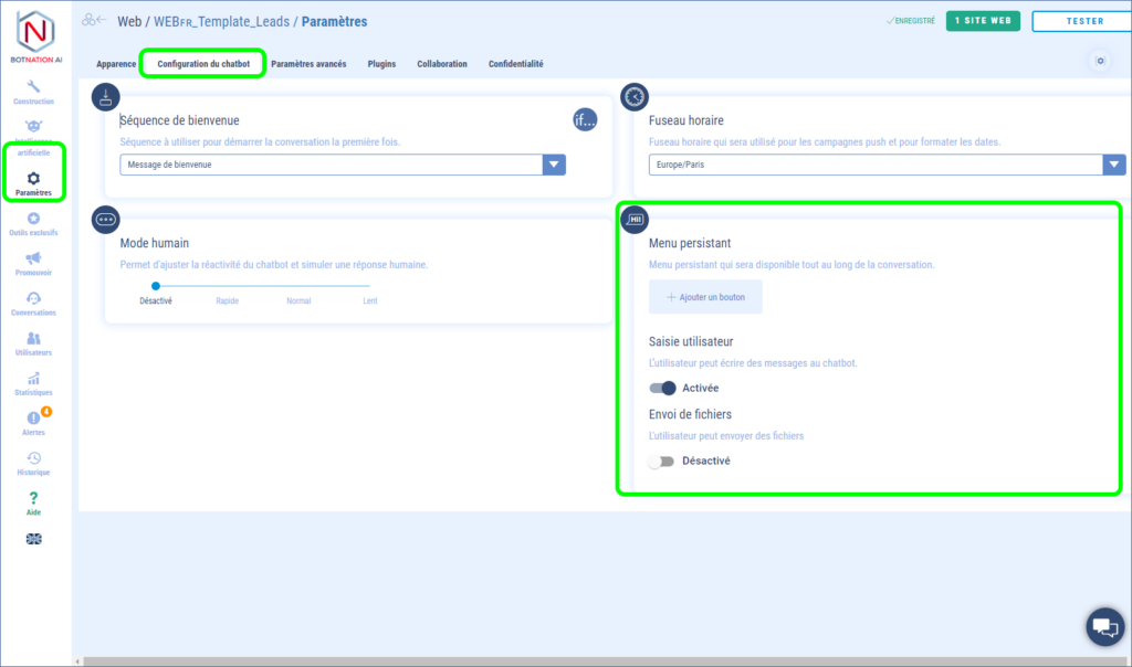 Ce menu se configure dans les « Paramètres » du chatbot dans l’onglet « Configuration du chatbot ».