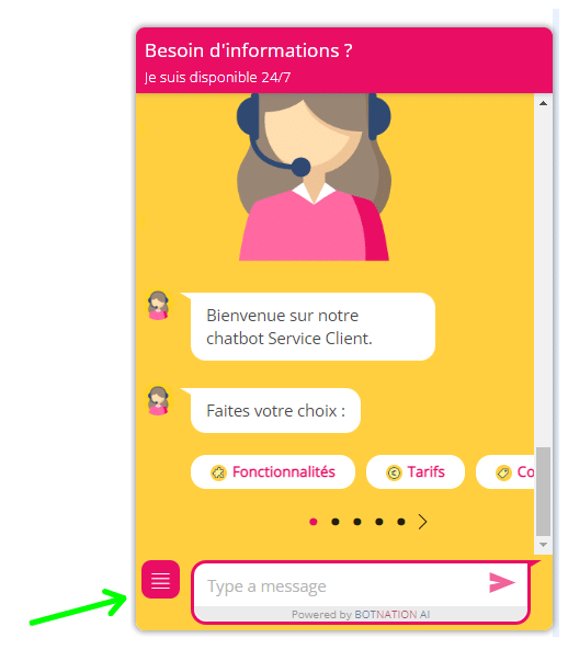 Le menu persistant reste toujours à la disposition de l’utilisateur, son affichage est permanent dans le chatbot, généralement en bas à gauche. Ce menu contient des actions prioritaires que les utilisateurs peuvent utiliser à tout moment.