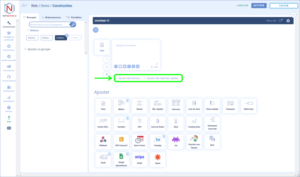 Voir les articles : Ajouter des boutons (Messenger), Ajouter des boutons (Chatbot Web), Ajouter des Réponses Rapides (Messenger) et Ajouter des Réponses Rapides (Chatbot web) pour en savoir plus