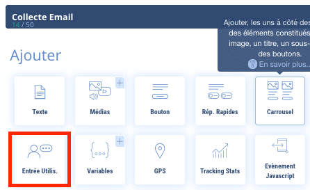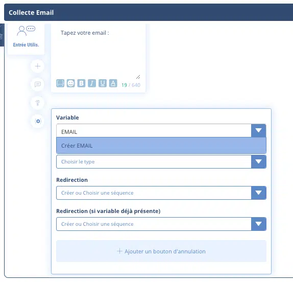 Il vous suffit donc de faire une demande du type « Quel est votre email ? » et d’enregistrer la réponse dans une variable que vous créez, par exemple {{EMAIL}}. Pour cela, le module « Entrée utilisateurs » sera votre allié.
