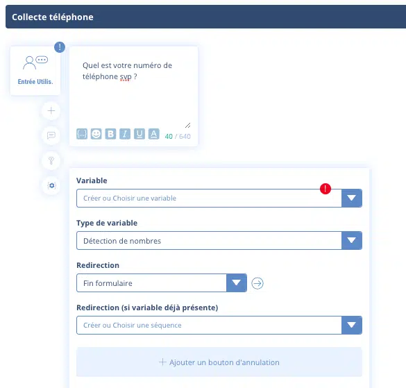 - Détection de nombres : le chatbot ne retiendra que les nombres, ce qui est très utile pour un numéro de téléphone par exemple.