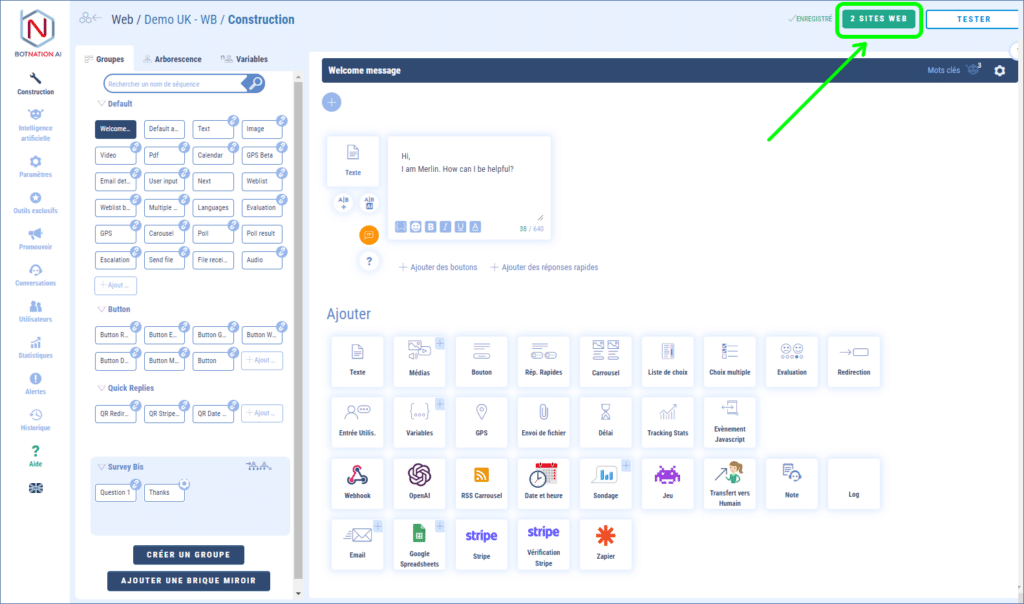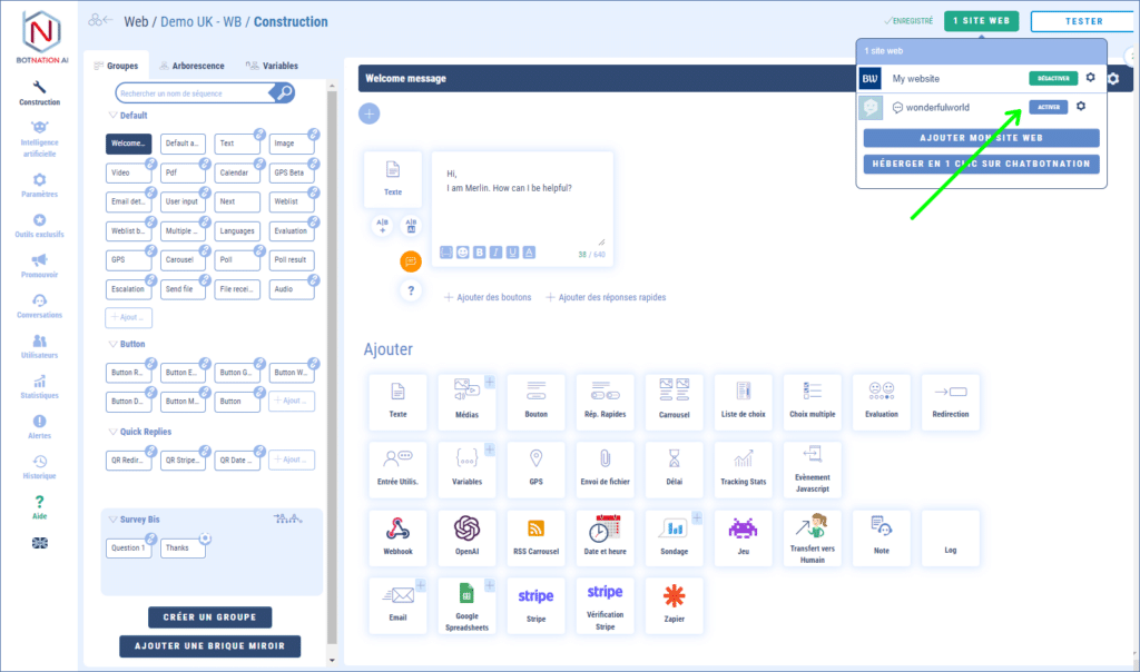 (en cliquant sur ce bouton, vous allez vous rendre dans votre chatbot).
