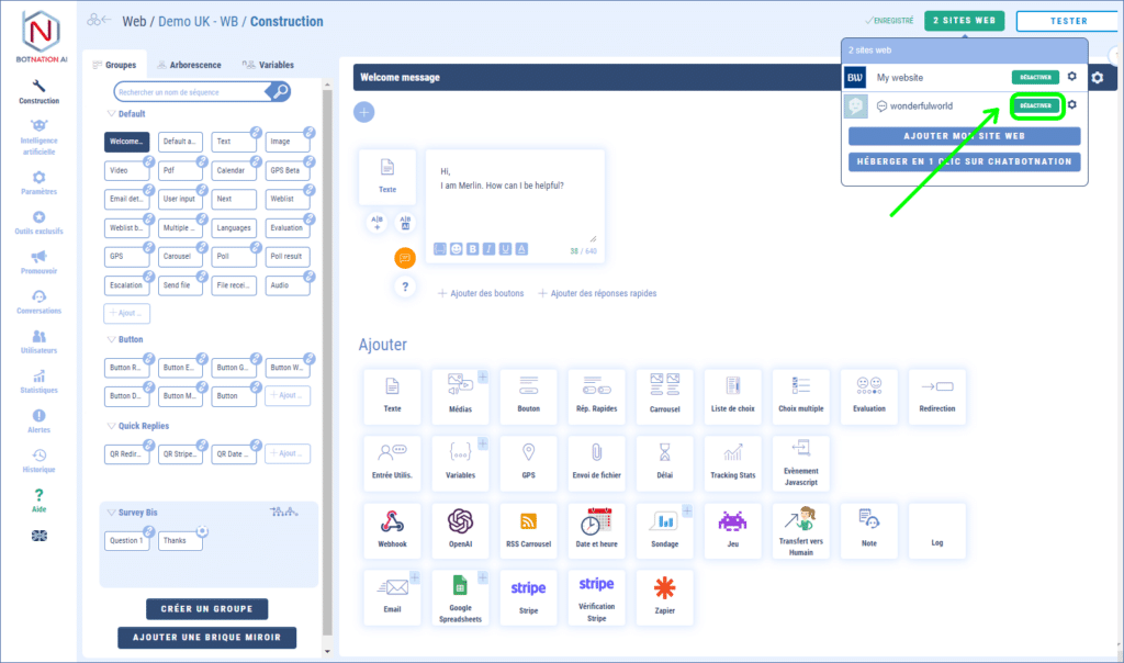 💡 Une deuxième page ou site à désactiver sur le même chatbot ? Il suffit de cliquer sur le bouton « Désactiver » en face de la page en question.