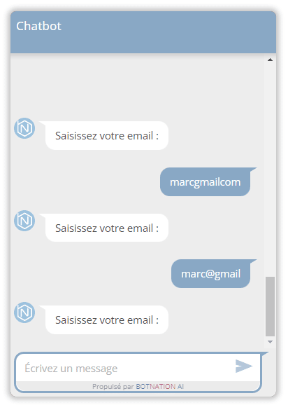 Quand vous choisissez le type de variable « Détection d’email » ou « Détection de nombre« , si la réponse saisie par l’utilisateur ne correspond pas au type correspondant, le chatbot considère que c’est une erreur et rejouera la séquence pour poser à nouveau la question. Hors, en terme d’expérience utilisateur c’est très frustrant de se voir poser la même question en boucle sans aucune explication.