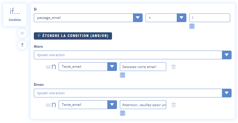 SINON on affectera la valeur « Attention, veuillez saisir un email de type martin@gmail.com : » à la variable « Texte_email » (valable pour tous les autres passages)