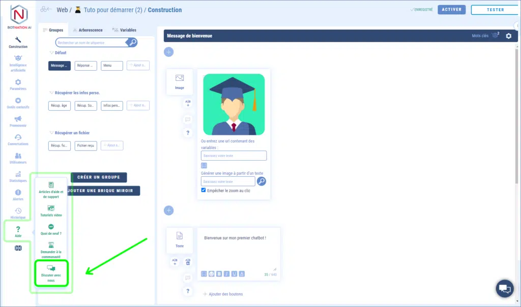 Et lorsque vous êtes en train de travailler sur votre chatbot, c’est dans l’onglet « Aide » que ça se situe.