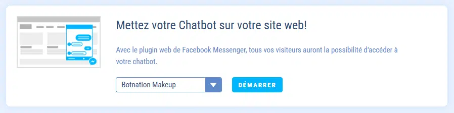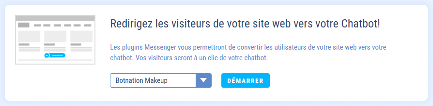 Cette fonctionnalité permet d’ajouter les plugins Checkbox ou Send To Messenger sur votre site web. Ces plugins permettent d’engager une conversion entre l’utilisateur de votre site web et votre chatbot par une simple click sur un bouton. Vous pouvez donc simplement transformer un utilisateur de votre site web en un utilisateur de votre chatbot.