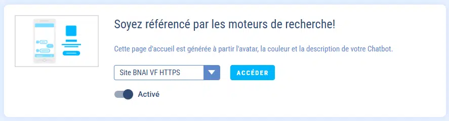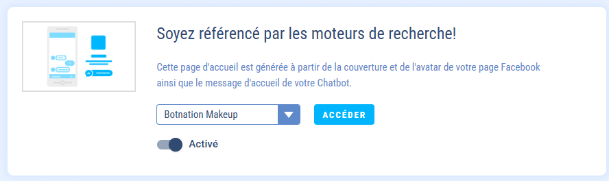 Comme pour les chatbots Facebook Messenger, nous générons automatiquement une page d’accueil pour votre chatbot vous permettant de le référencer sur les moteurs de recherche.