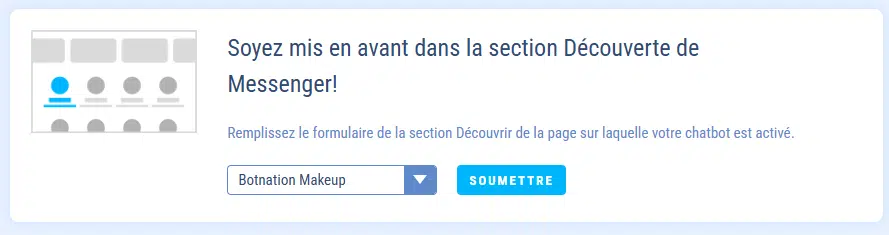 L’application Facebook Messenger offre une section « Découverte » pour permettre aux utilisateurs d’explorer et de trouver des chatbots selon certaines catégories. Cette fonctionnalité vous redirige donc vers les paramètres de votre page Facebook vous permettant de remplir le formulaire d’inscription à la section « Découverte »