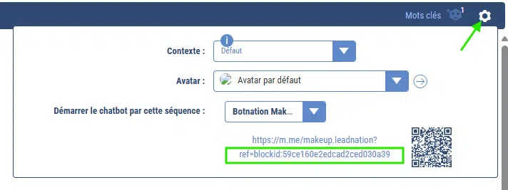 Vous avez aussi la possibilité, pour chacun des deux plugins, d’ajouter une « ref » qui représentent l’identifiant d’une séquence de votre bot sur laquelle vous voulez directement rediriger l’utilisateur lorsqu’il interagira avec le plugin. Ces identifiants peuvent se retrouver sur la séquence au niveau de la barre de titre de celle-ci en passant la souris au dessus du lien « m.me » :