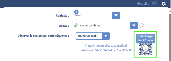Cette fonctionnalité vous permet de générer un QR code qui vous pourrez utilisez sur vos supports marketing afin de rediriger automatiquement l’utilisateur vers votre chatbot directement dans l’application Facebook Messenger.