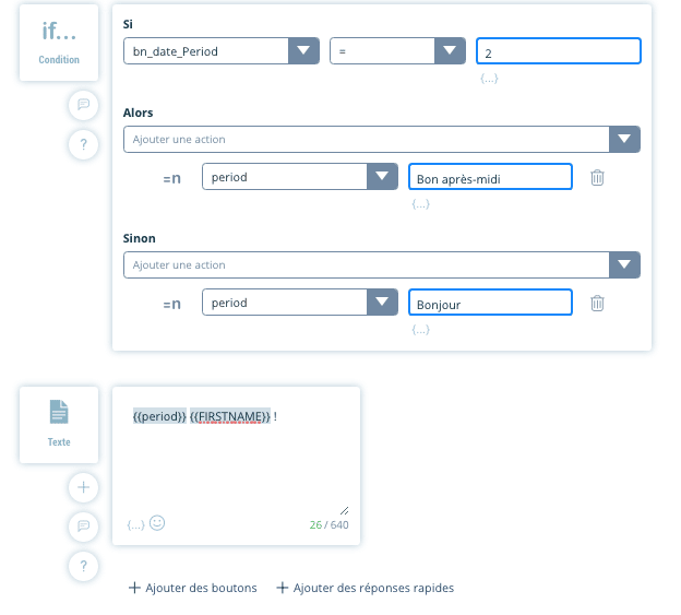 Nous prenons en compte le TimeZone de l’utilisateur. Concrètement au même instant, un chatbot peut donc à présent afficher « Bonjour » à un français et « Bonne nuit » à un japonais en utilisant la variable magique {{bn_date_Period}} .