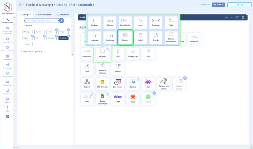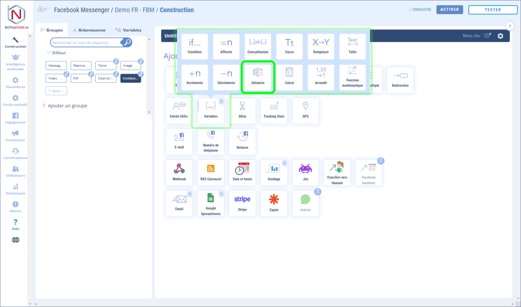 Parmi les fonctionnalités de construction, cliquez sur « Variables » puis, dans le menu qui s’ouvre, cliquez sur « Aléatoire ».