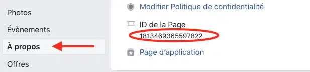 Il faut vous rendre sur les paramètres de la page Facebook concernée, vous retrouverez cet identifiant dans la section « À propos », comme indiqué sur la capture ci-dessous.