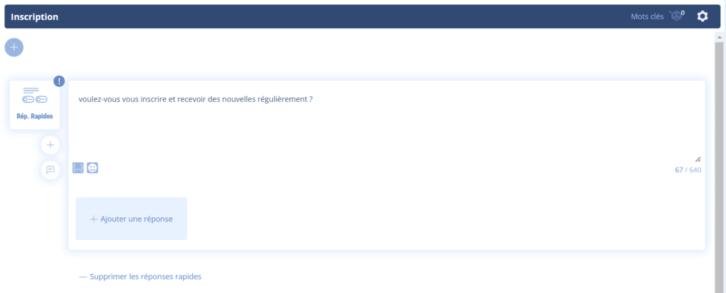 2:  dans cette séquence « inscription », il vous suffit d’utiliser un élément « réponses rapides« ,  cela fonctionne également pour les boutons classiques, et de formuler une question du type: « voulez-vous vous inscrire et recevoir des nouvelles régulièrement ? »