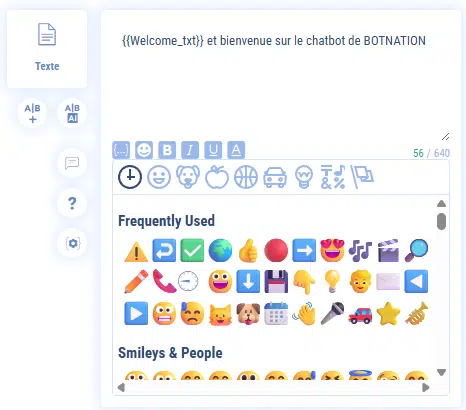 Un clavier regroupant les principaux emojis est dĂ©sormais disponible directement dans lâĂ©dition de votre chatbot sur Botnation.
