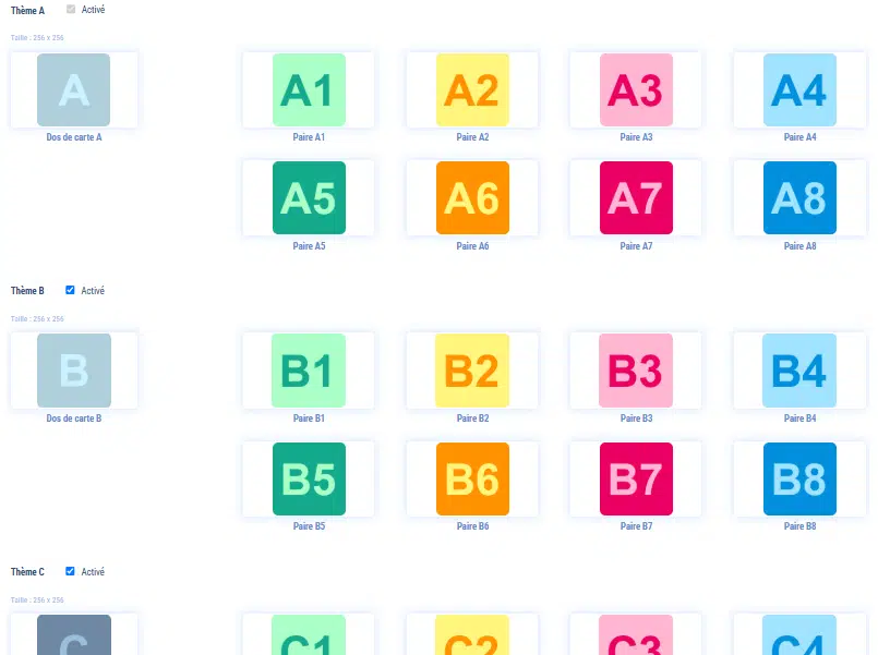 Le modèle de jeu Memory fonctionne avec une rotation de thèmes. C’est-à -dire que si le joueur réussit à trouver toutes les paires du premier thème et qu’il lui reste du temps, le prochain thème dans la rotation lui sera affiché.