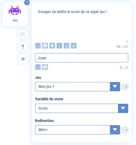 L’intégration du jeu dans le chatbot se fait via la story « Jeu ». Cette story doit obligatoirement se trouver en fin de séquence.